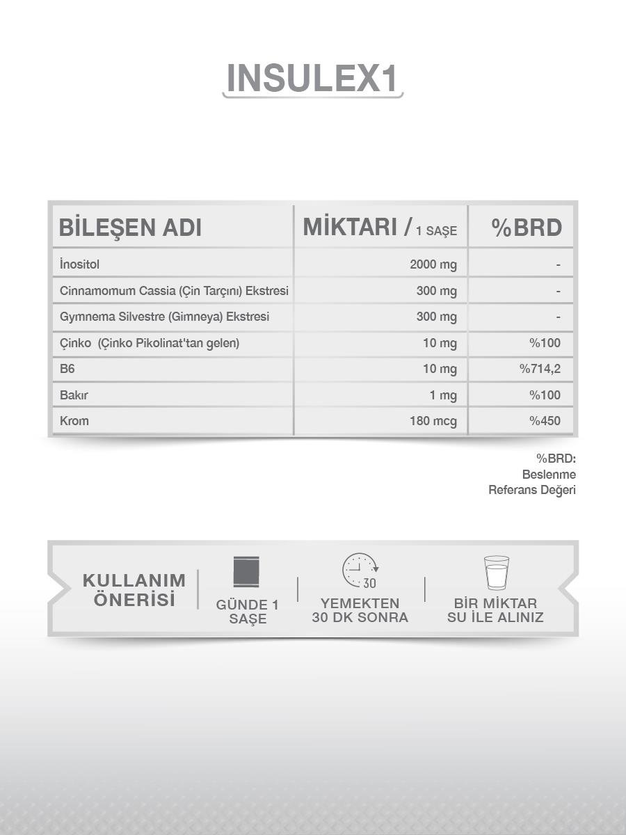 İçindekiler: İnositol, Taşıyıcı (Gam arabik (akasya gamı)), Gymnema silvestre Ekstresi, Cinnamomum cassia Ekstresi, Çinko pikolinat, Piridoksin hidroklorür (Vitamin B6), Bakır Sülfat, Krom pikolinat, Doğal Limon Aroması, Steviol glikozitler.