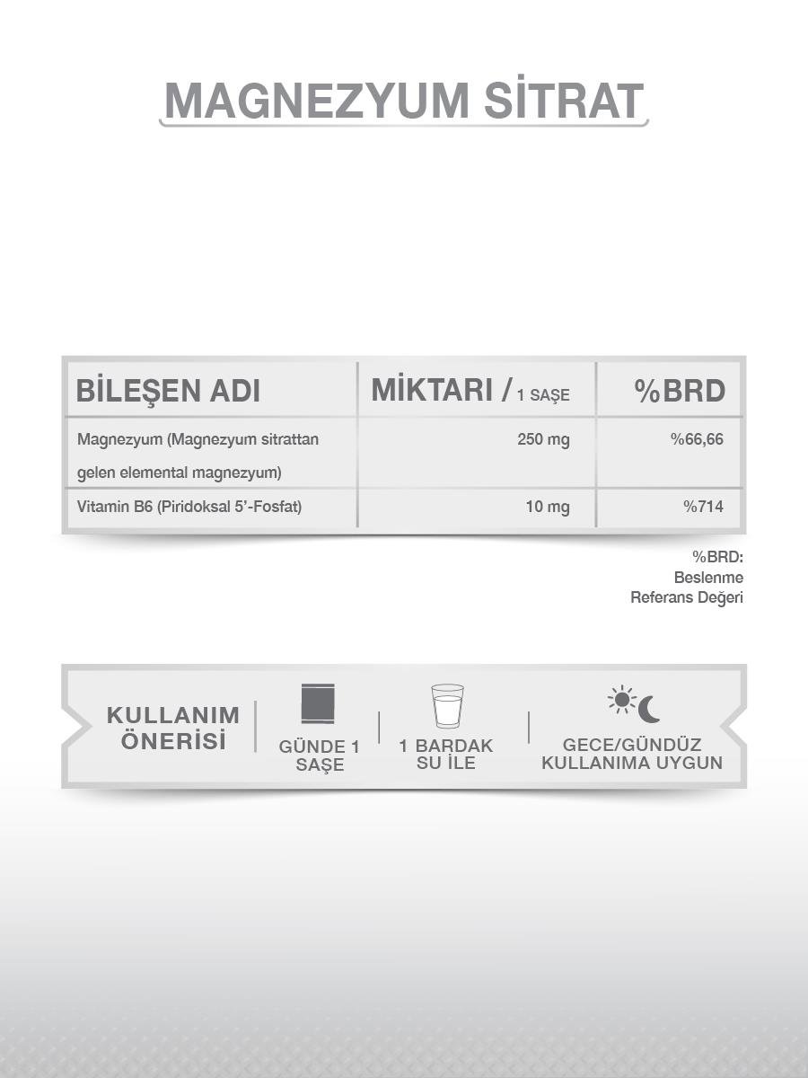 İçindekiler: Tri Magnezyum Sitrat, Gam arabik, Sitrik Asit (Asitlik Düzenleyici), Portakal Aroması (Aroma Verici), Steviol glikozitler (Tatlandırıcı), Vitamin B6 (Piridoksal 5ꞌ -fosfat).