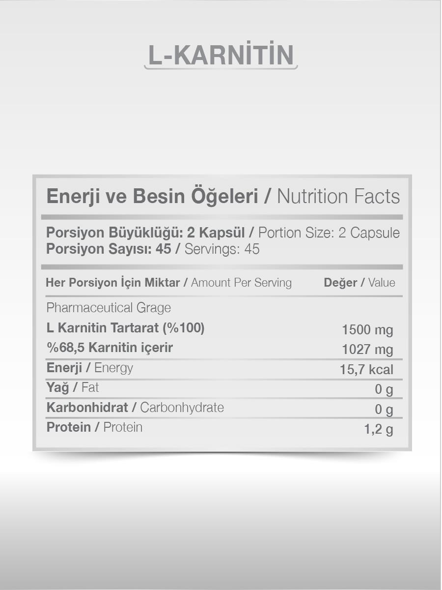 İçindekiler: L-Karnitin Tartarat, Hidroksipropil metil selüloz (Bitkisel kapsül)